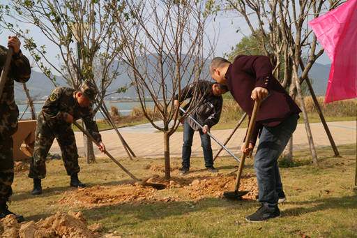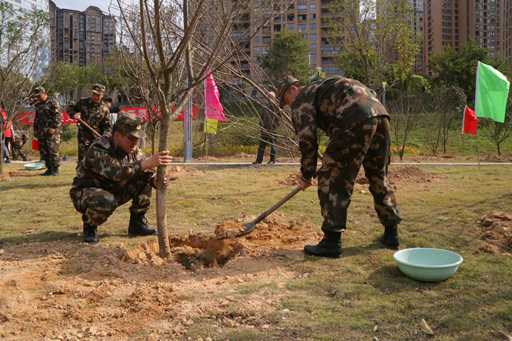 植树现场,国防生同地方群众、学生一起填土、浇水,大家分工有序,干得十分起劲。植树间隙,林学专业国防生还结合自身专业所长,为植树群众和学生普及树种知识,当看到自己亲手种下的一株株树苗,一张张疲惫的脸上露出了满意的笑容。参加植树活动的2014级国防生柴世品告诉笔者:拥有林业人和武警森林部队后备警官双重身份的我们,理应为美丽中国的建设尽一份责任。在大家的齐心协力下,共计种下百余棵树苗,为闽江江岸增添了一抹“春绿”。